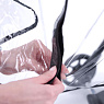 Дождевик просто крепится на прогулочную коляску и надежно фиксируется.
